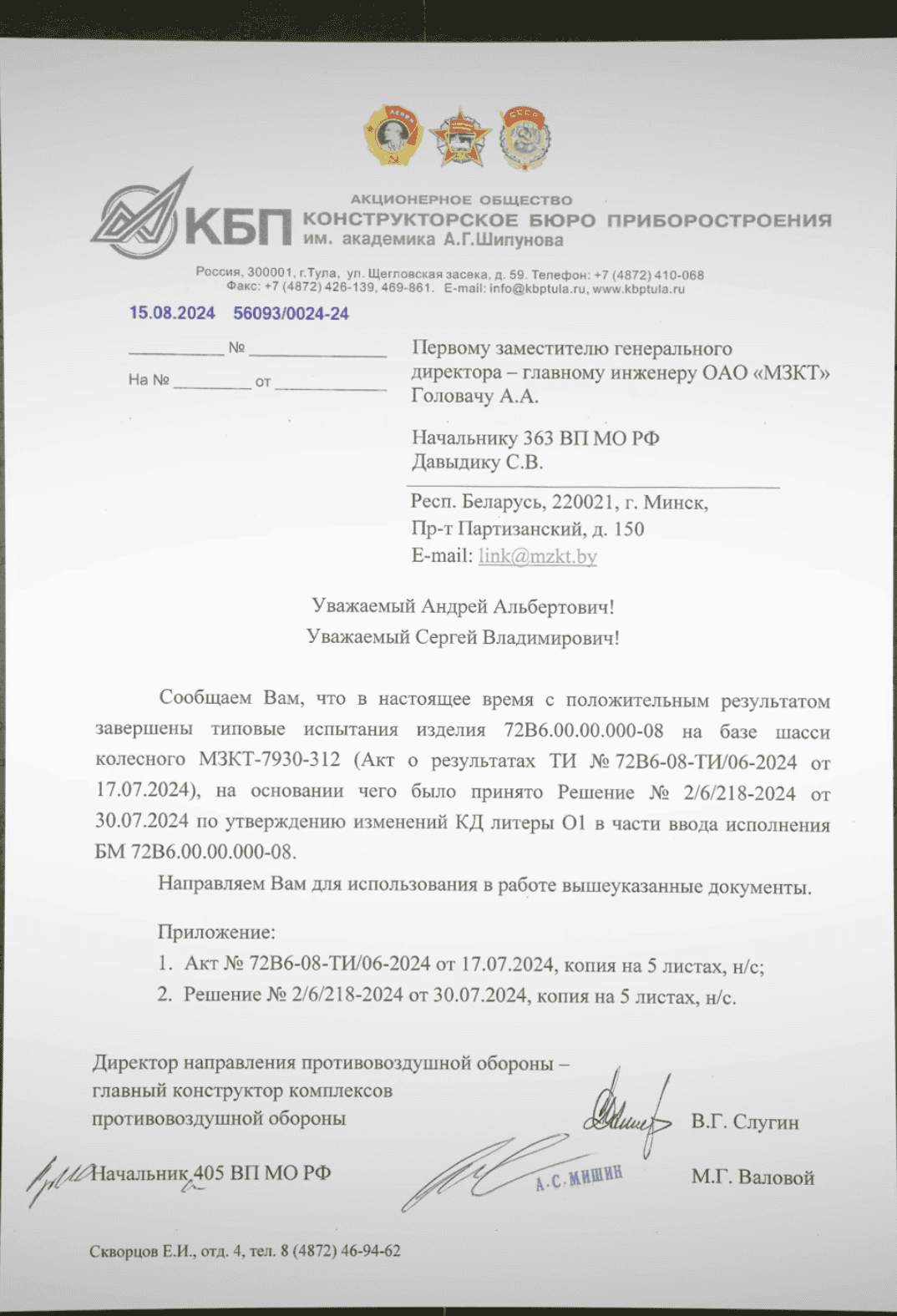 The documents indicate that combat module 72V6.00.00.000-08 was integrated onto the MZKT chassis. The 72V6 index points to a Pantsir-S1 variant for the Russian Armed Forces rather than an export version or the newer Pantsir-S2.