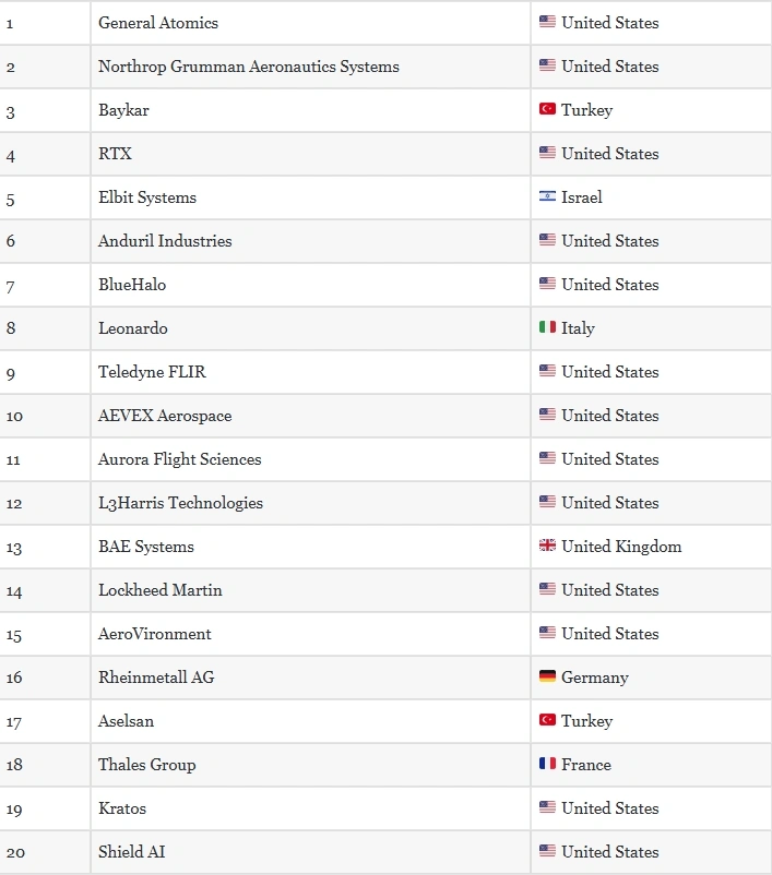 The list is based on an independent assessment of global unmanned systems manufacturers, with a focus on drone-related revenue and contributions to the development of autonomous defense technologies.