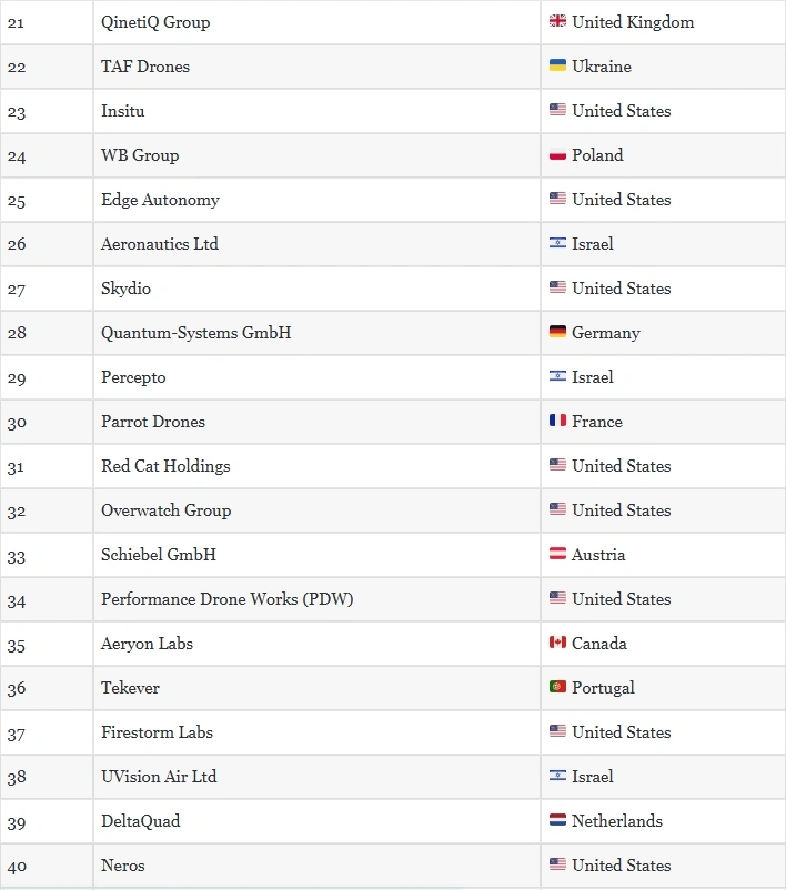 Several Ukrainian companies made the list. TAF Drones, which develops FPV drones, reconnaissance UAVs, and electronic warfare and intelligence systems, ranked 22nd.