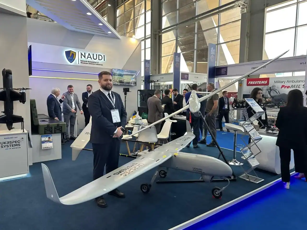 The company Ukrspetssystems also presented its products, including the Shark-M unmanned aerial vehicle, as well as the companies General Cherry and SkyFall, showcasing the interceptor drones Bullet and P1-SUN. Additionally, UKRARMOTECH is displaying the GYURZA-03 MRAP pickup and the DESNA off-road vehicle.
