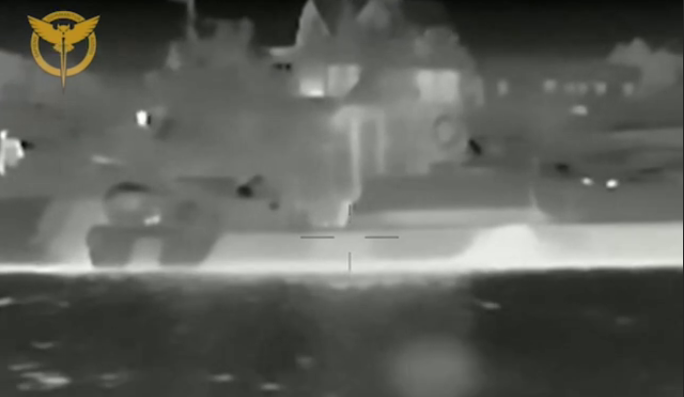 The released video shows a group of drones attacking the Russian Project 1176 craft at night.