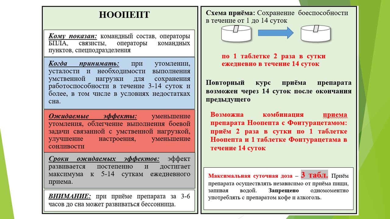 «Фонтурацетам» та «Ноопепт» — це ноотропи, які покращують пам’ять, фокусування уваги та зменшують сонливість. Вони рекомендуються для командирам підрозділів, операторам озброєння та спецпризначенцям. Відчутний вплив з’являється на 5-14 добу прийому препаратів, які дозволяється застосовувати разом та комбіновано.