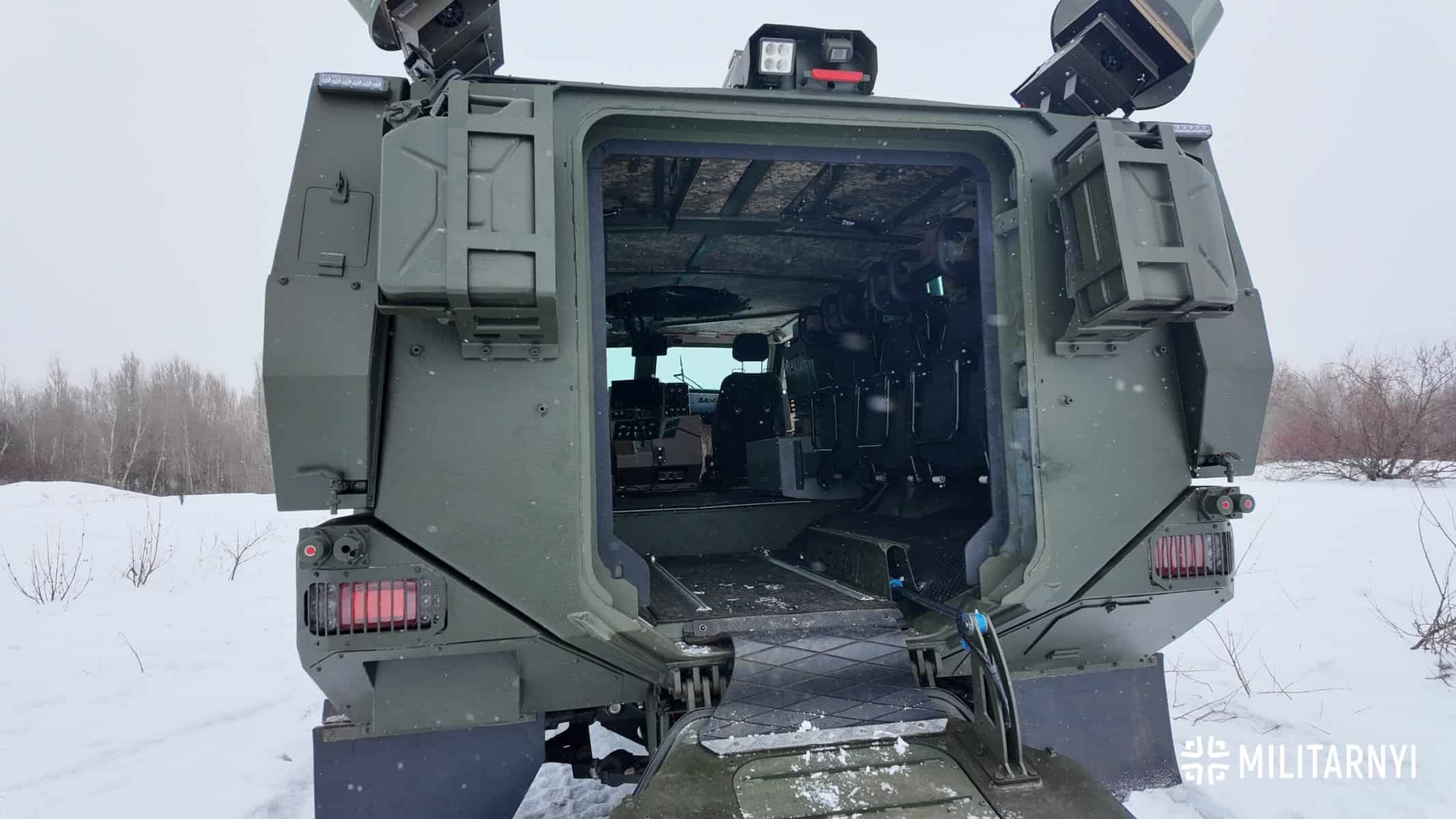 На бортовій панелі також відображається вид з передньої та задньої камери огляду, які мають денний та нічний режим спостереження. З неї ж керується задня апарель та робота бортової системи РЕБ.