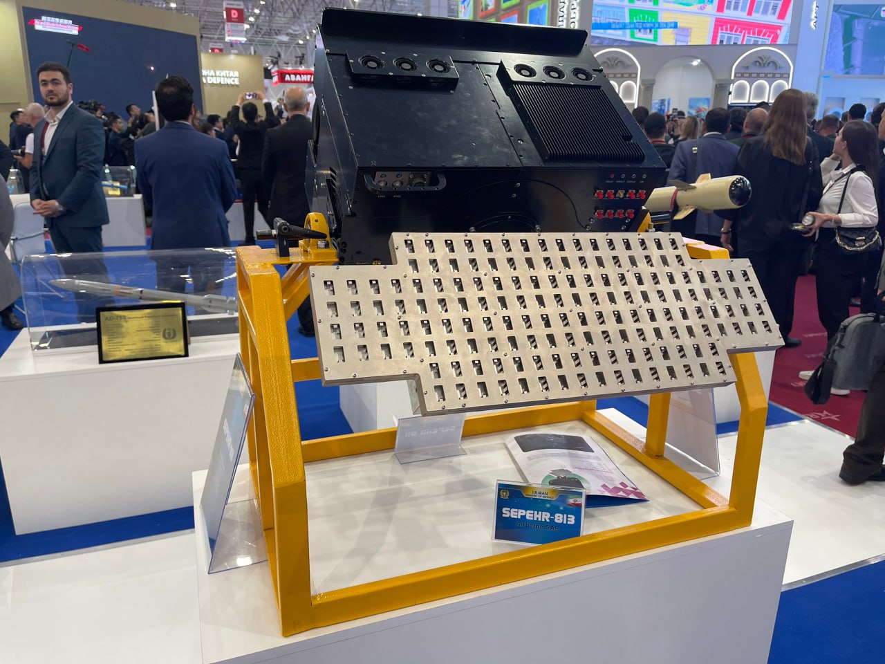 Іранський стенд представив велику кількість озброєння, зокрема, радіолокаційну станцію виявлення повітряних цілей Sepehr 813 SAR, кілька моделей ударних безпілотних літальних апаратів, а також балістичну ракету Zoheir малої дальності з радіусом ураження в 500 кілометрів.