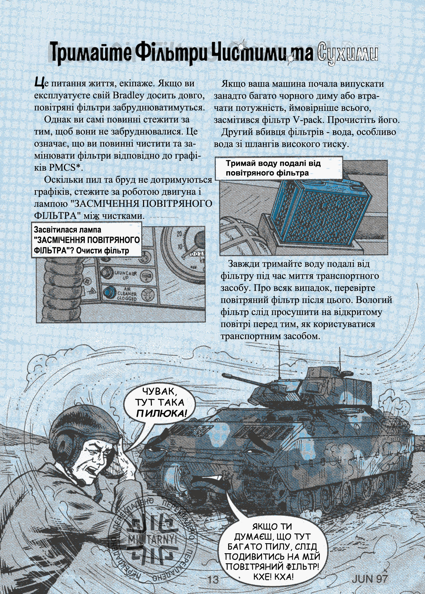 Продовжуємо тему літнього обслуговування військової техніки в екстремальних умовах пилу, піску і спеки. Ця тема все ще залишається актуальною для ЗСУ, враховуючи де саме проводиться контрнаступ і які температурні позначки можуть бути на півдні. Тим паче на тому театрі військових дій ми й пустелю маємо. Таким чином цей переклад коміксу від PS Magazine у літню погоду завжди буде актуальним для вас і вашої машини.