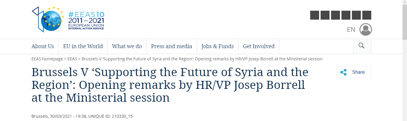 Сирія: Сьогоднішні відомості по Сирії по Сирії хотів би обмежити виступом Верховного представника ЄС із закордонних справ і політики безпеки Жозепа Борреля «Підтримка майбутнього Сирії та регіону».