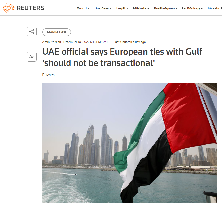 ОАЕ: Високопоставлений чиновник Об’єднаних Арабських Еміратів заявив у суботу, що спонукає бачити більше залучення в Європу країн Перської затоки в умовах конфлікту в Україні та енергетичної кризи. «Те, що ми чуємо, особливо від німців та інших, про відновлення взаємодії з країнами Перської затоки, мене надихає, але я б попередив, що це не повинно бути трансакцією», — сказав Анвар Гаргаш, дипломатичний радник президента ОАЕ. «Я думаю, що ця мова частково обумовлена власним інтересом — спробою знайти нових постачальників газу, нових постачальників нафти», — сказав він. «Нам потрібно бачити дії… вони мають бути довгостроковими та стратегічними».