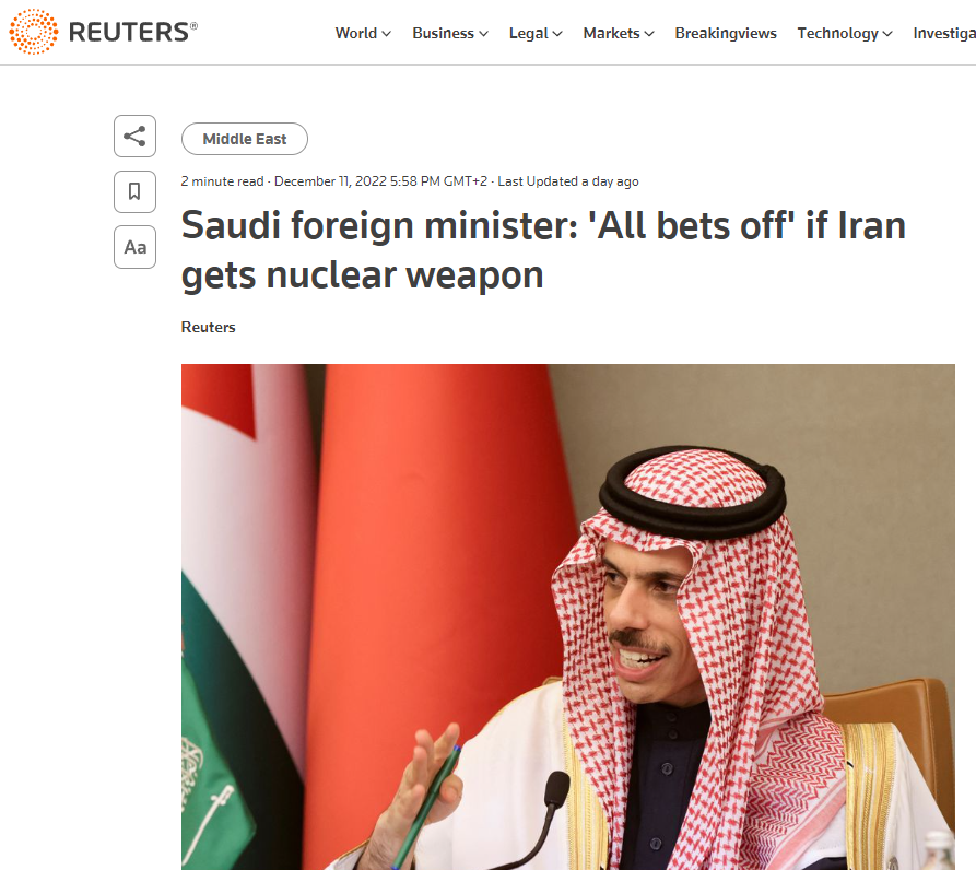 Саудівська Аравія: Міністр закордонних справ Саудівської Аравії: «Всі ставки програють», якщо Іран отримає ядерну зброю». Про таке принц Фейсал бін Фархан Аль Сауд заявив в інтерв’ю на сцені Всесвітньої політичної конференції в Абу-Дабі, коли його запитали про такий сценарій. «Ми знаходимося в дуже небезпечному просторі в регіоні… можна очікувати, що регіональні держави, безумовно, будуть дивитися на те, як вони можуть забезпечити власну безпеку».
