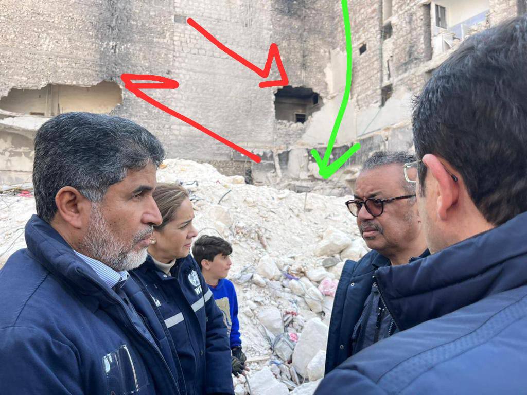 А щоб приманити ще більше «гуманітарки» урядовці сирійського режиму йдуть на свідомий обман чиновників ООН. На світлині нижче видно як асадит демонструє голові Всесвітньої організації охорони здоров’я (WHO) розтрощені бомбардуваннями райони Алеппо, видаючи їх за руйнування в наслідок землетрусу. У будівлі, яка на задньому плані видно чітку діру в стіні від артилерійського або танкового обстрілу, та бруд, що скупчився, — від просідання старої будівлі.