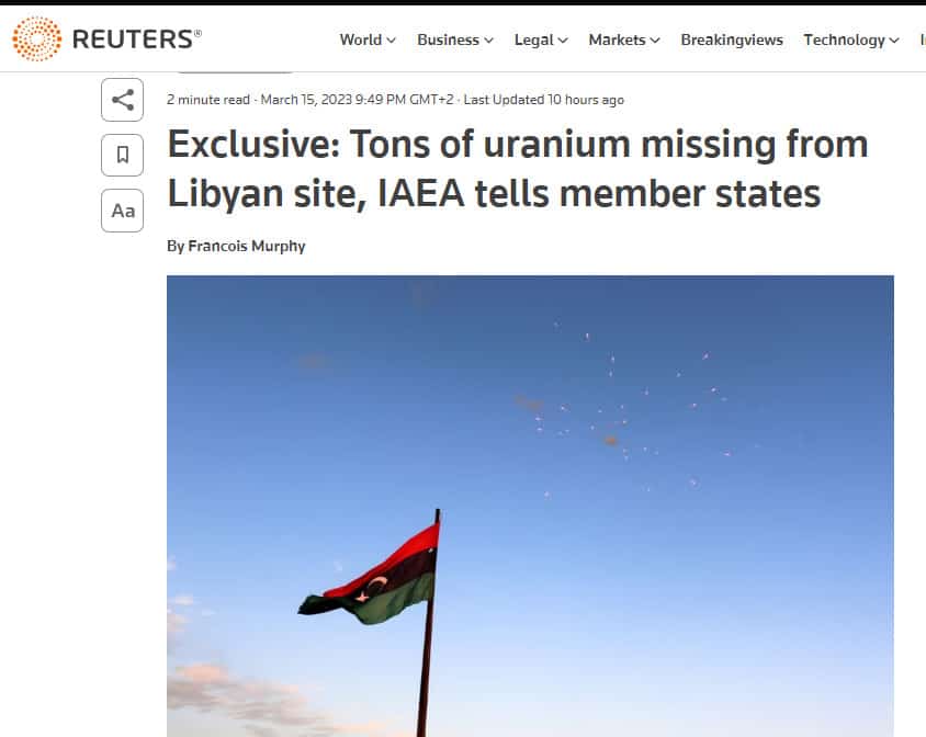 Лівія: Інспектори ядерної служби ООН виявили, що приблизно 2,5 тони природного урану зникли з лівійського об’єкта, який не перебуває під контролем уряду, повідомила наглядова організація державам-членам у заяві в середу, з якою ознайомилося Reuters.