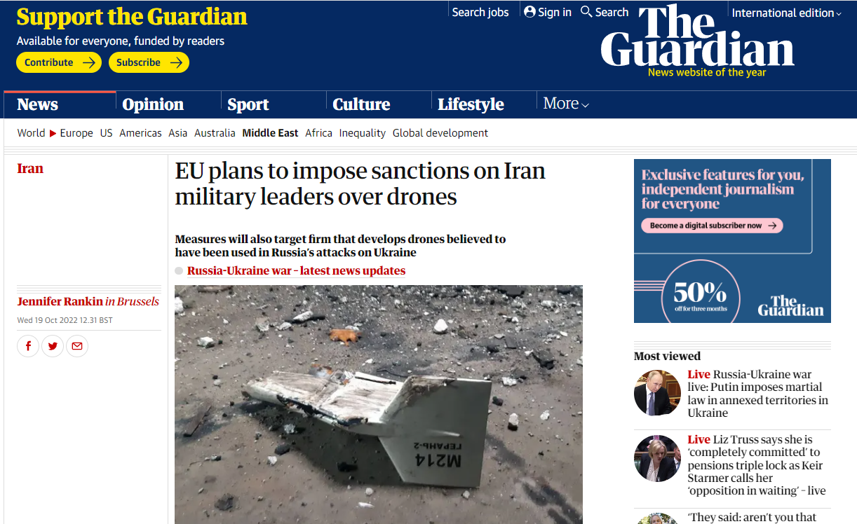 ЄС планує накласти санкції на трьох високопоставлених іранських військових і компанію, яка розробляє безпілотники, які, ймовірно, використовувалися під час нападів росії на Україну. Очікується, що проект санкційного списку, з яким ознайомилася Guardian, буде узгоджено протягом кількох днів, що свідчить про те, що міністри ЄС не вірять запереченням Ірану, що він постачав росії летальну зброю низького польоту. Ці пропозиції надійшли після того, як Урсула фон дер Ляєн, голова Європейської комісії, засудила удари росії по критичній енергетичній інфраструктурі як «акти чистого терору», які прирівнюються до військових злочинів.