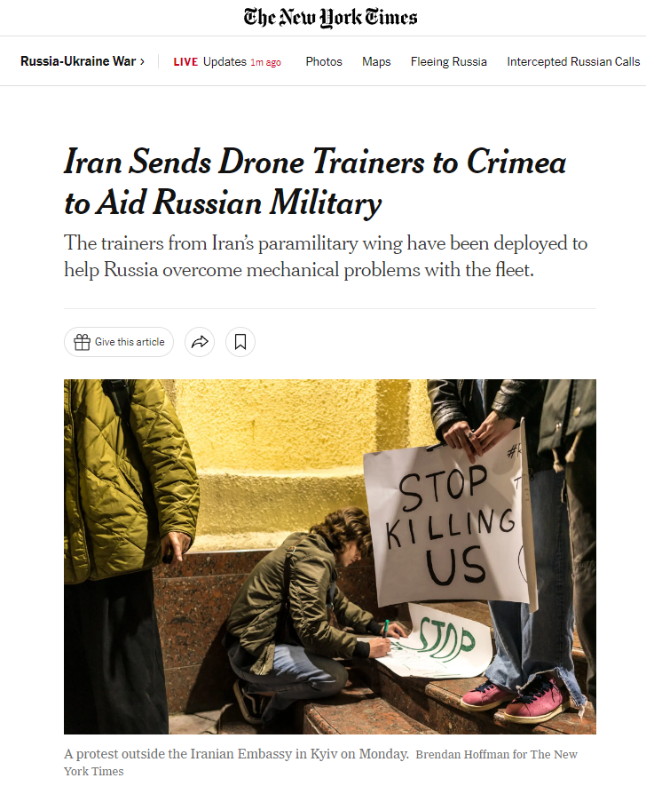 Іранські тренажери працюють з російської військової бази в Криму, де базується багато безпілотників з моменту доставки з Ірану. Інструктори з Корпусу вартових ісламської революції, підрозділу іранської армії, визнаного Сполученими Штатами терористичною організацією. Розгортання іранських тренажерів, схоже, збігається з активізацією використання безпілотників в Україні та свідчить про більш глибоку участь Ірану у війні.