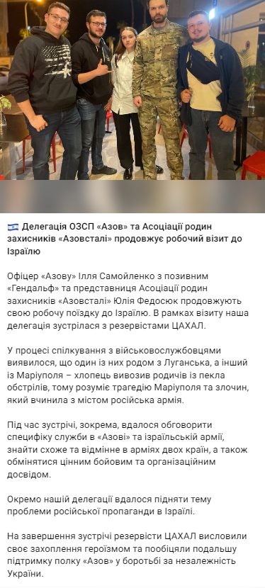 Ізраїль: Делегація полку “Азов” нещодавно відвідала Ізраїль, де зустрілася з офіційними особами і резервістами ЦАГАЛу, а також розповіла про війну, яка триває в Україні. Про це повідомляє Jerusalem Post.