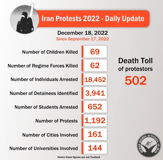 В Ірані пішов четвертний місяць протестів. Повідомляється, що понад 500 протестувальників загинули з 17 вересня по всьому Ірану. Однак правозахисники очікують, що реальні цифри будуть набагато вищими.