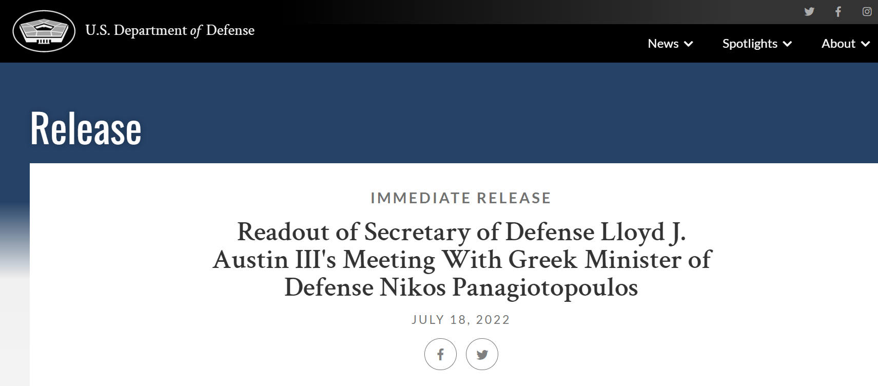 Греція: Як випливає з прес-релізу Міністерства оборони США з приводу зустрічі міністрів оборони США та Греції Ллойда Остіна та Нікоса Панайотопулоса: «Міністри також обговорили необхідність зниження напруженості в Егейському морі шляхом конструктивного діалогу. Зазначивши, що найближчими днями Ллойд Остін поговорить телефоном з міністром оборони Туреччини Акаром. Міністр оборони США закликав обидві сторони вивчити прагматичні вирішення давніх суперечок».