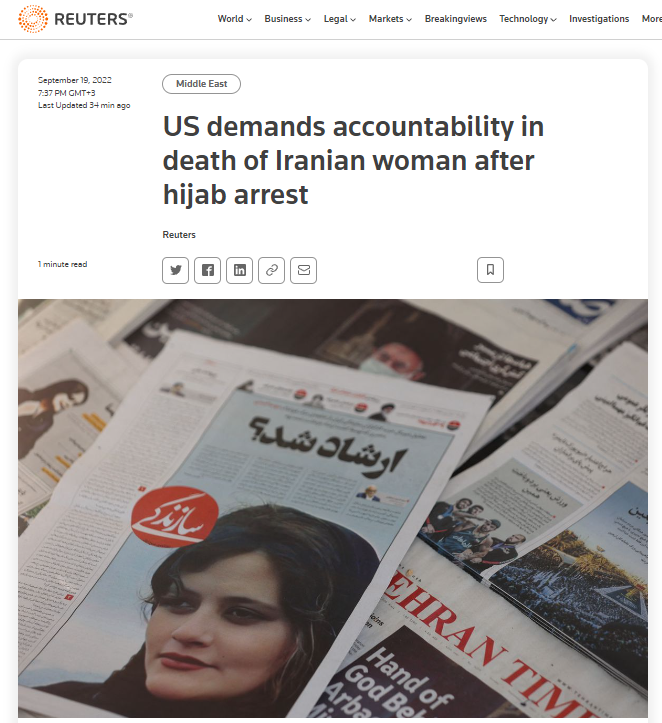 Іран: Сполучені Штати вимагають притягнення до відповідальності винуватців у смерті іранської жінки після її арешту в Тегерані минулого тижня за носіння «неналежного» хіджабу, заявив у понеділок речник Ради національної безпеки Білого дому. «Смерть Махси Аміні після травм, отриманих під час перебування під вартою в поліції за носіння «неналежного» хіджабу, є жахливим і кричущим порушенням прав людини», — сказав чиновник.