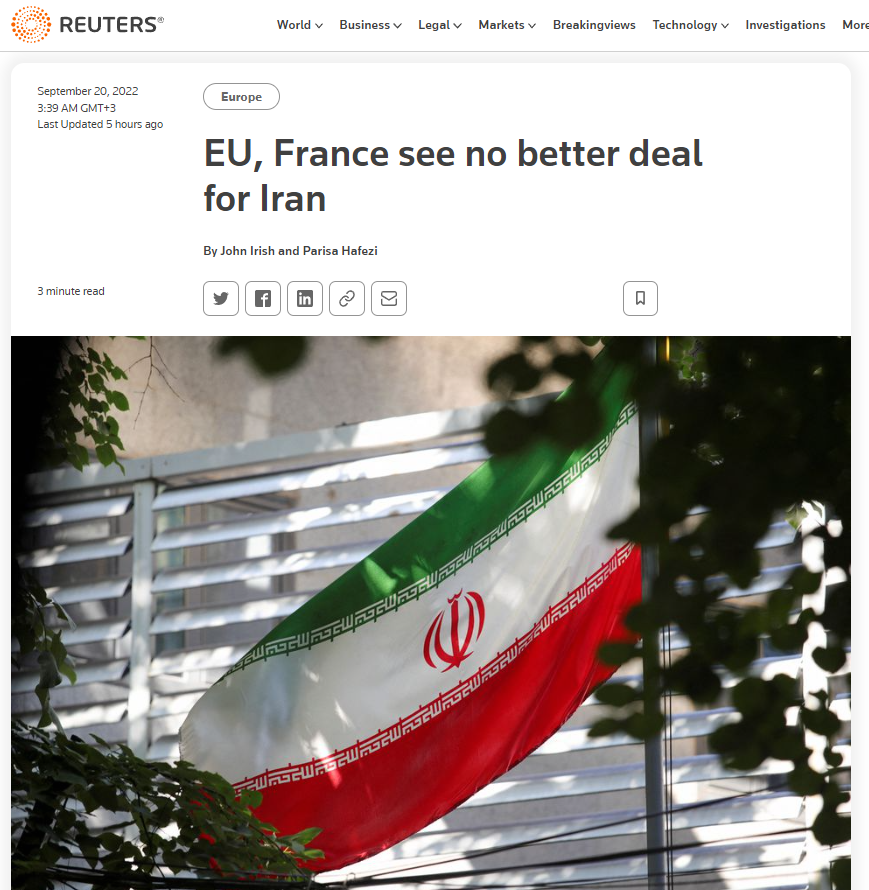 У понеділок Франція заявила, що для Ірану не буде кращої пропозиції відновити ядерну угоду зі світовими державами, і Тегеран повинен прийняти рішення зараз разом з координатором ЄС на переговорах, заявивши, що бачить мало шансів на прогрес цього тижня. «На столі не буде кращої пропозиції, і Іран має прийняти правильні рішення», — заявила журналістам міністр закордонних справ Франції Катрін Колонна в кулуарах Генеральної Асамблеї ООН у Нью-Йорку, додавши, що жодних ініціатив не було, щоб розблокувати ситуацію.