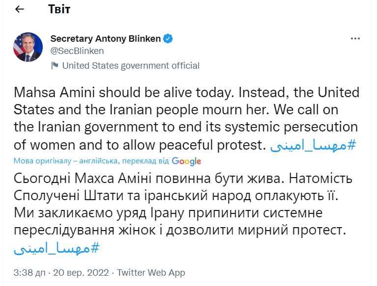 «Наші думки з родиною та близькими Махси». «Жінки в Ірані повинні мати право носити те, що вони хочуть, без насильства чи переслідувань. Іран повинен припинити використання насильства щодо жінок за здійснення своїх основних свобод», – сказав чиновник. «За смерть Махси має бути відповідальна».