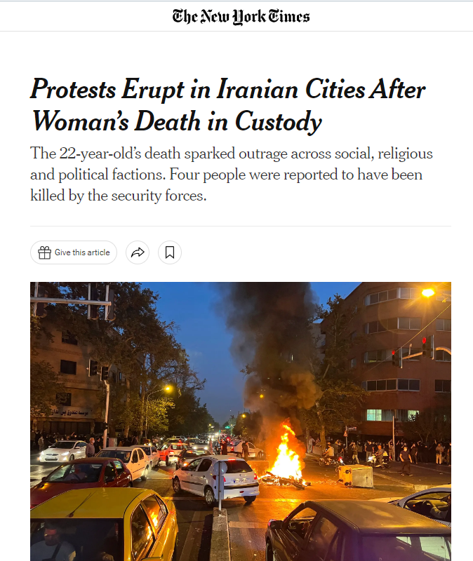 Судячи з відео, опублікованих іранськими журналістами в соціальних мережах, сили безпеки в столиці стріляли з вогнепальної зброї та водометів, переслідували протестувальників і били їх кийками. У рідній провінції пані Аміні на північному заході, Курдистані, де протести назрівають після її похорону в суботу, четверо чоловіків у трьох містах були застрелені, повідомила Kurdistan Human Rights Group, яка опублікувала їхні імена та фотографії в Інтернеті.