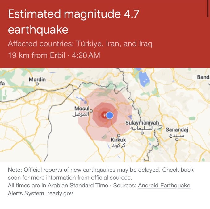 Ірак: Іншим відлунням турецького землетрусу став поштовх у 4,7 бали з епіцентром біля столиці Іракського Курдистану – міста Ербіль. Звідси інформація про руйнування не надходила.
