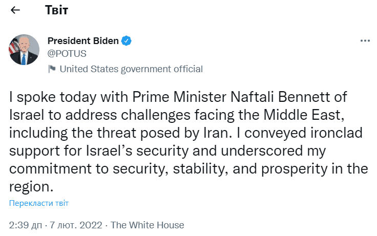 Ізраїль: Прем’єр-міністр Ізраїлю провів телефонну розмову з президентом США. Темою розмови стало посилення агресії Ірану в регіоні. У відповідь Байден опублікував повідомлення підтримки Ізраїлю на тлі викликів, які існують.