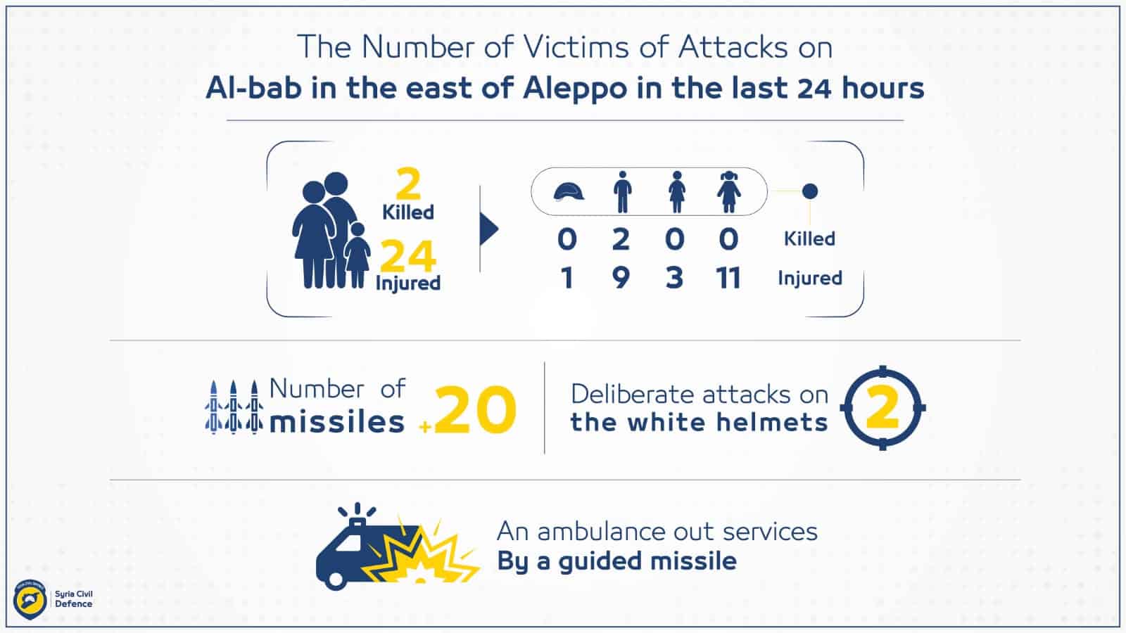 «Білі Шоломи» підрахували наслідки атаки бойовиків РПК міста Аль-Баб на півночі Алеппо, який знаходиться в зоні операції турецьких військ «Щит Євфрату». Атака була проведена вчора з РСЗВ.