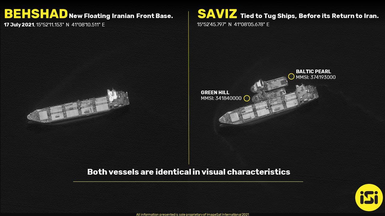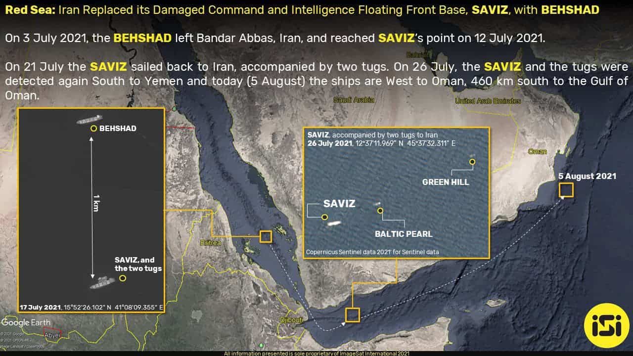 Іран: У Червоному морі з’явилася нова передова плавуча база ВМС КВІР Ірану. Раніше, переобладнане під базу іранське вантажне судно SAVIZ піддалося нападу 6 квітня 2021 року пропрацювавши в тій самій південній частині акваторії Червоного моря кілька років. Чотири місяці по тому його замінило аналогічне судно BEHSHAD.