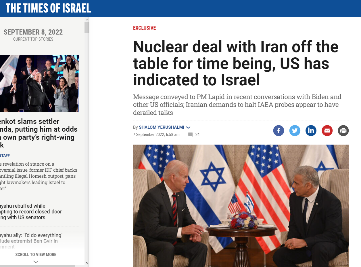 Ізраїль: Нова ядерна угода між Іраном і світовими державами не розглядається і не буде підписана в осяжному майбутньому, стало відомо ізраїльському дочірньому сайту The Times of Israel Zman Yisrael. Таке послання було передано прем’єр-міністру Яіру Лапіду в його нещодавніх розмовах з президентом США Джо Байденом та іншими офіційними особами адміністрації.