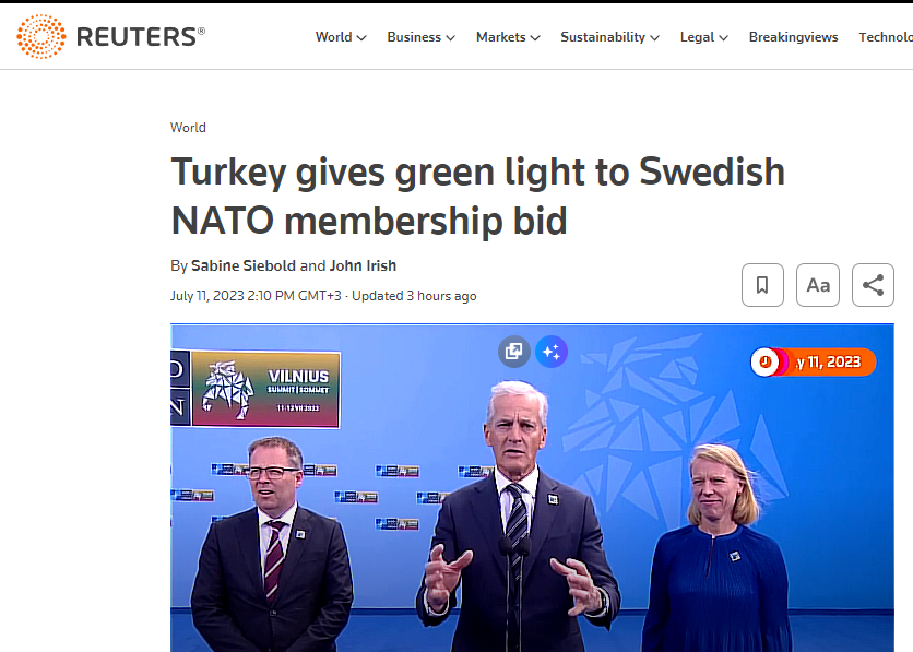 «Я радий повідомити… що президент Ердоган погодився передати протокол про приєднання Швеції до Великої національної асамблеї якнайшвидше та тісно співпрацювати з асамблеєю, щоб забезпечити ратифікацію», — сказав генеральний секретар НАТО Єнс Столтенберг на прес-конференції, назвавши це «історичним» кроком.
