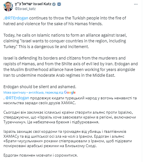 Він назвав звинувачення Ердогана в тому, що Ізраїль хоче завоювати країни Близького Сходу, “небезпечною брехнею та підбурюванням”. “Ізраїль захищає свої кордони і громадян від вбивць і ґвалтівників ХАМАСу, а також від шиїтської осі зла, очолюваної Іраном”, – сказав Кац. “Ердоган і альянс “Брати-мусульмани” роками працювали разом з Іраном, щоб підірвати помірковані арабські режими на Близькому Сході.