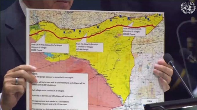 Зона безпеки в Сирії. “Туреччина не переживе нову хвилю міграції. Терор на сході Євфрату повинен бути зупинений”. Показав карту і запевнив, що при такому розкладі від мільйона до двох мільйонів сирійських біженців повернуться на ці землі. Більше того, він запропонував збільшити безпекову зону і на східному березі Євфрату на територіях які знаходяться під протекторатом США.
