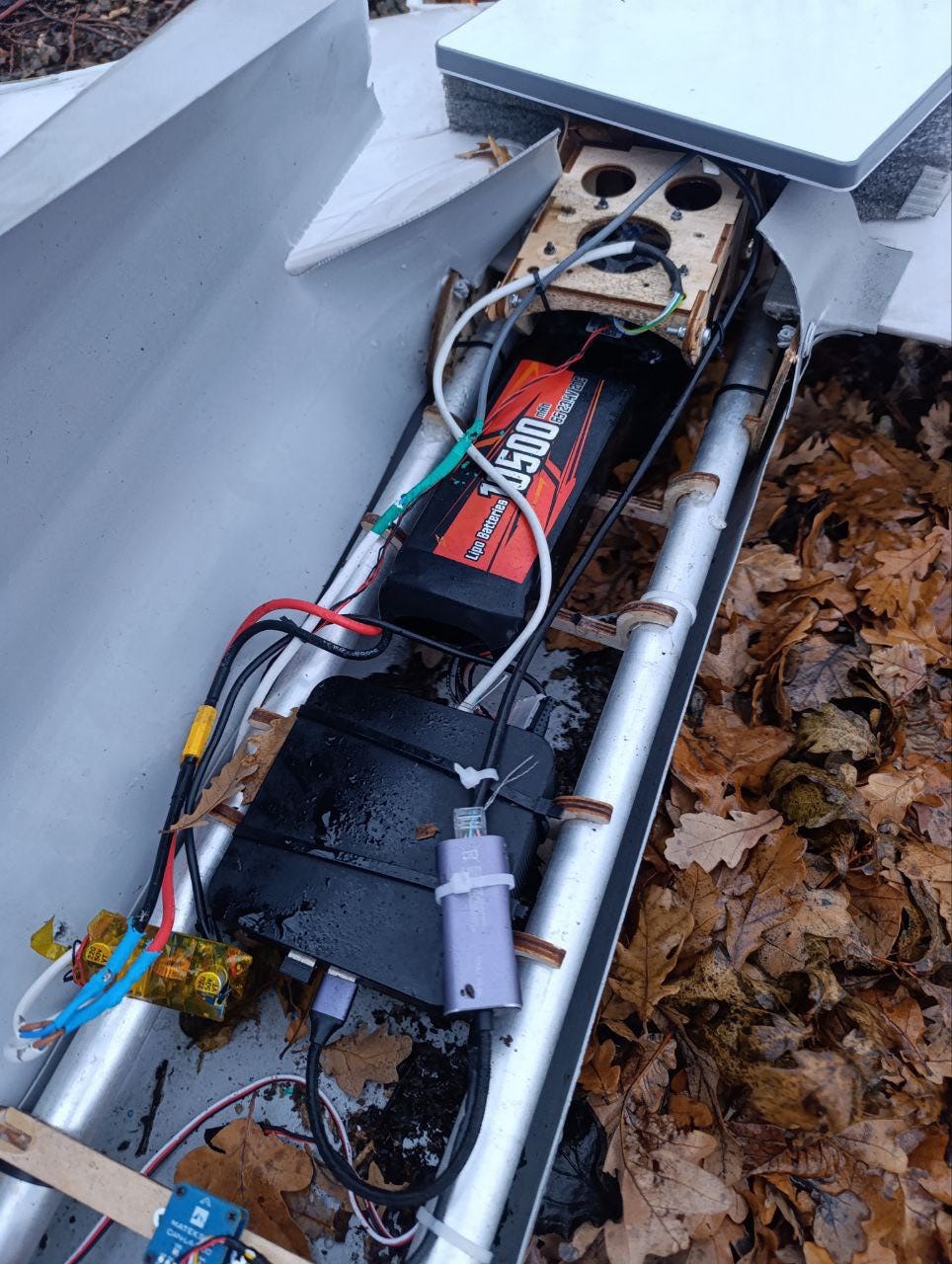 Згідно повідомлень в соціальних мережах, в районі Покровська нещодавно було знайдено розвідувальний БПЛА противника зі Starlink Mini на борту. На першому фото ми бачимо пошкоджений апарат, схожий на лінійку БПЛА «Молния», після непланового приземлення. На другому фото бачимо вскриту його задню частину та встановлену електроніку.