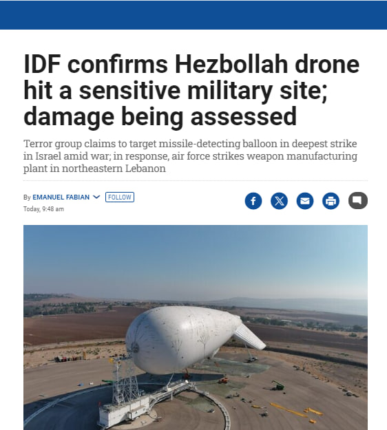 Армія оборони Ізраїлю підтвердила у четвер, що “Хезболла” зуміла вразити важливий військовий об’єкт у Нижній Галілеї за допомогою безпілотника-камікадзе. Під час атаки в середу «Хезболла» стверджувала, що запустила заряджені вибухівкою дрони на базу ПС Ізраїлю, з якої керують гігантським аеростатом, відомим як Sky Dew. База розташована поблизу перехрестя Голані, приблизно за 35 кілометрів (21 милю) від кордону з Ліваном.