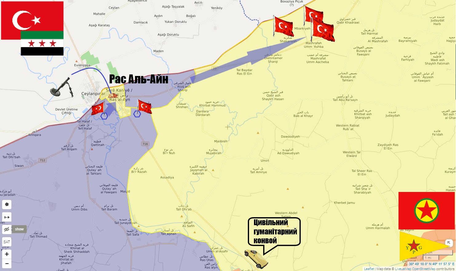 Намагаючись, хоч якось полегшити стан курдських бойовиків в Рас-аль-Айні, інша група курдів з боку Талль Тамра організувала так званий «цивільний гуманітарний конвой» та намагається прорватися в оточене місто. Для прикриття цієї провокації курди використовують англійських журналістів. Пам’ятаєте? Кілька днів тому такий самий «цивільний гуманітарний конвой» був обстріляний в самому Рас-аль-Айні, загинули два французьких журналіста. Сторони звинуватили одна одну у цьому нападі.
