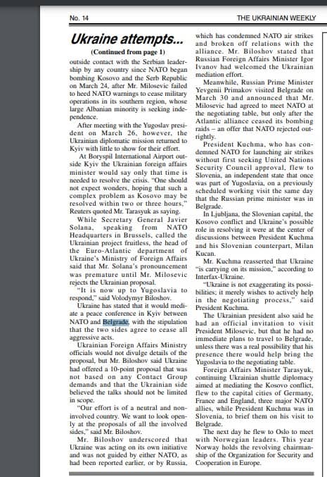 Крім того, міністр закордонних справ України (Борис Тарасюк) та міністр оборони (Олександр Кузьмук) прибули до Белграда вже 27 березня 1999 року, лише через два дні після початку бомбардування.