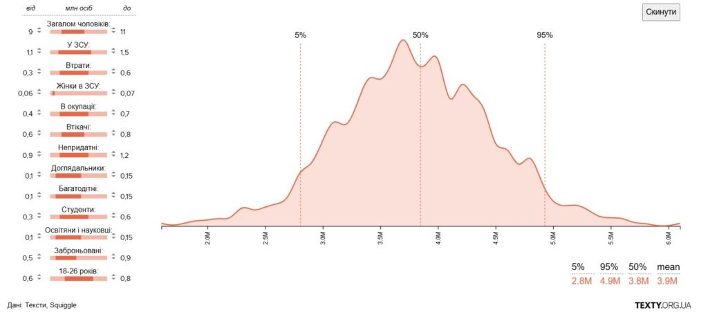 Наприклад, загальна кількість чоловіків оцінюється в межах 9–11 млн, а за кордон виїхало 300-600 тис чоловіків призовного віку. Таких діапазонів достатньо, щоб оцінити наявний мобрезерв. На виході буде не точна цифра, а розподіл ймовірностей.