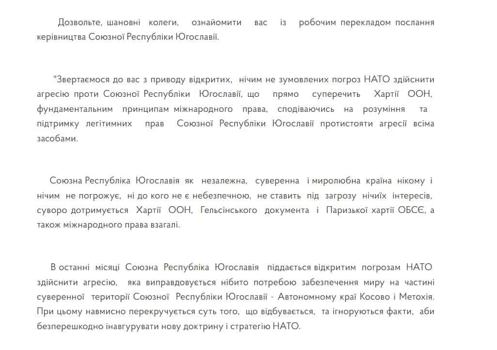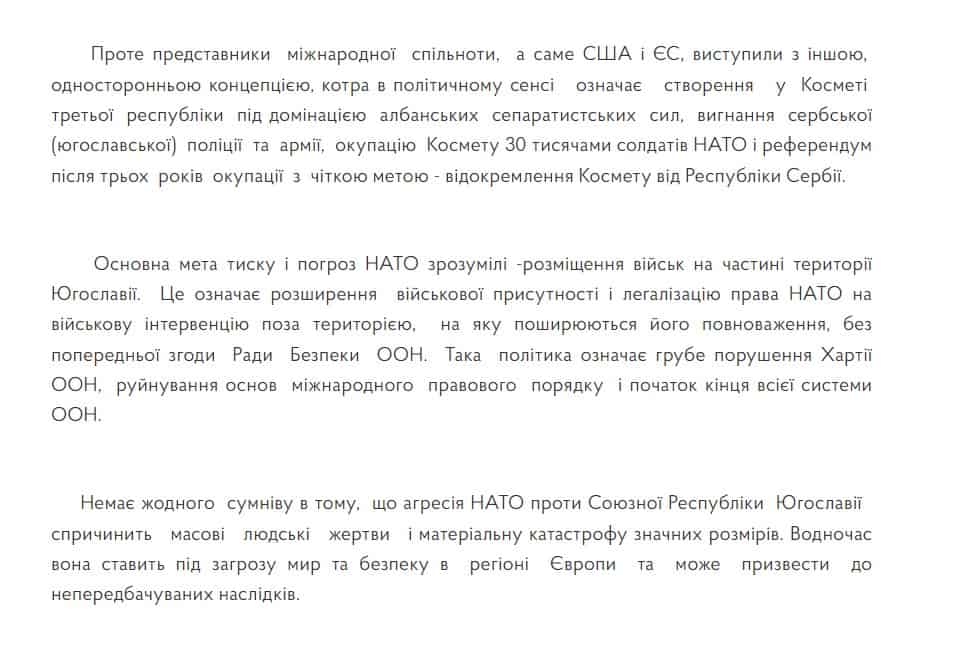 Коли конфлікт у Косово став загострюватися, то багато українських ЗМІ зайняли прозахідну позицію у висвітленні подій звідти. Але були і такі медіа, які відкрито демонстрували просербську позицію. На жаль, поза увагою журналістів та експертів залишилася офіційна позиція української влади щодо авіакампанії Північноатлантичного альянсу проти СРЮ. Тодішній президент України Леонід Кучма, прем’єр-міністр Валерій Пустовойтенко та низка високопосадовців засудили дії альянсу. Питання про те, що необхідно НАТО припинити бомбардування Югославії розглядалося не один тиждень у березні – квітні 1999 року депутатами Верховної Ради України. Не писали про це і сербські медіа, тому цей епізод був забутий.
