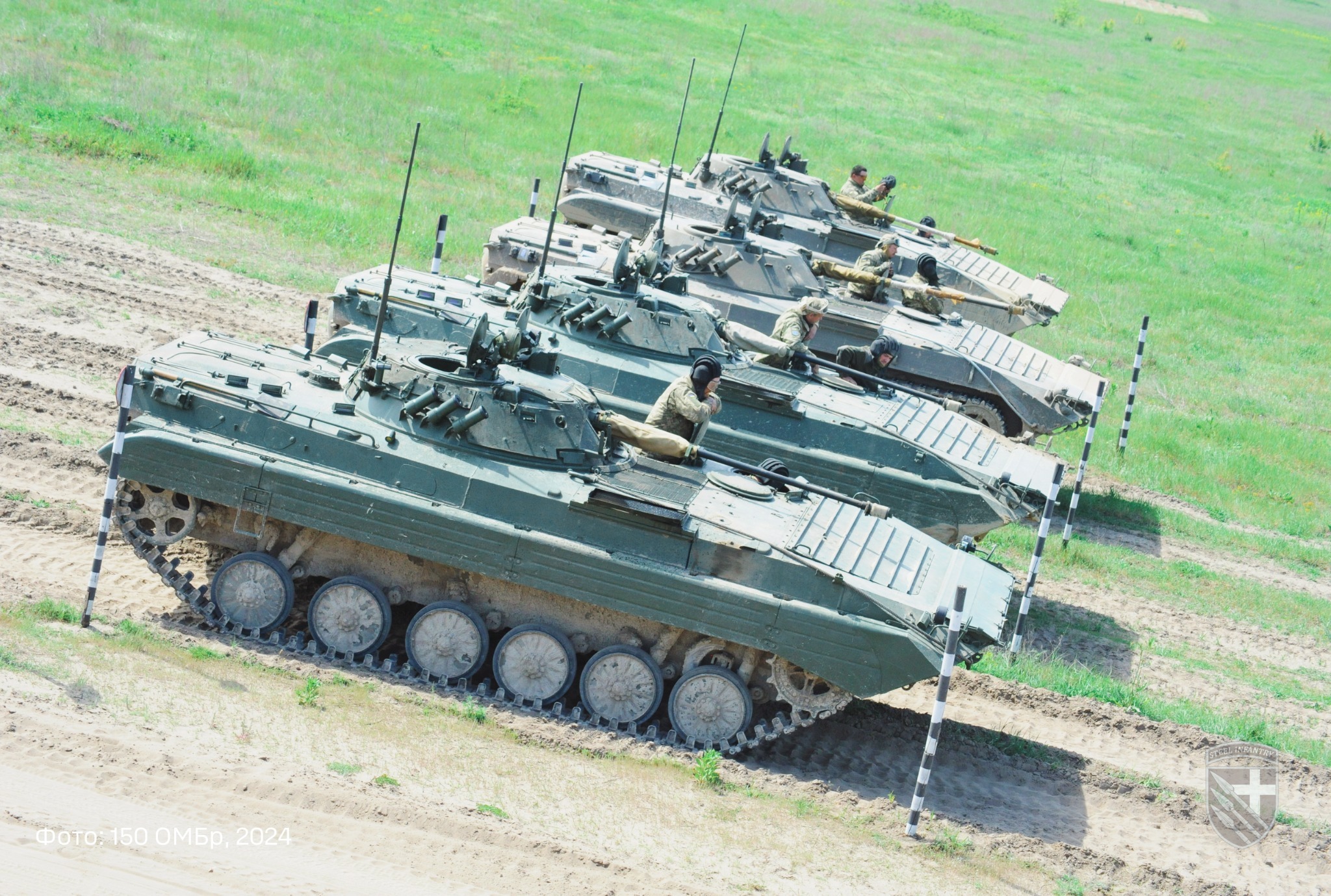 «Бійці 150 ОМБр вдосконалюють навички водіння бойових машин. Регулярні тренування дозволяють нашим військовим максимально ефективно долати перешкоди на будь-якій місцевості», — повідомляють у пресслужбі формування, показуючи залучену до вправ техніку.