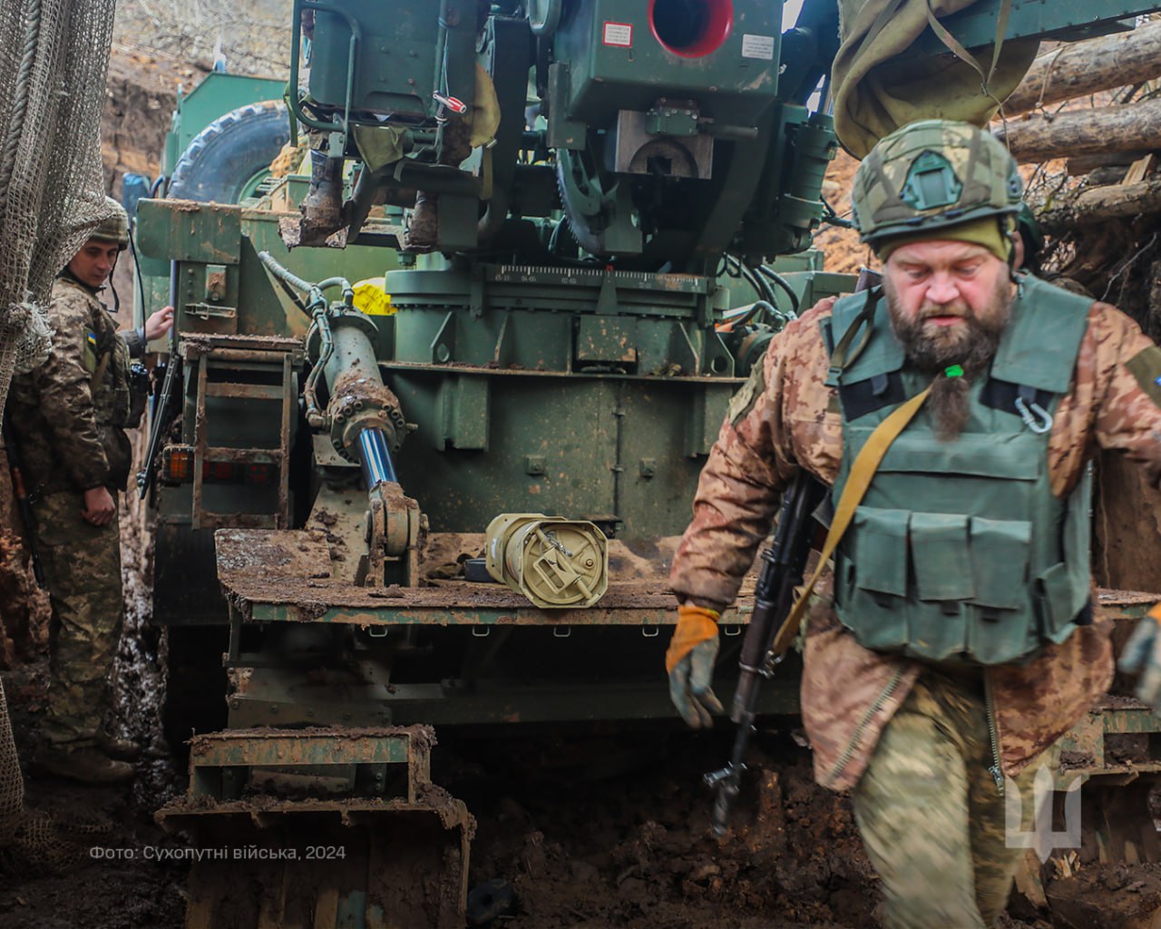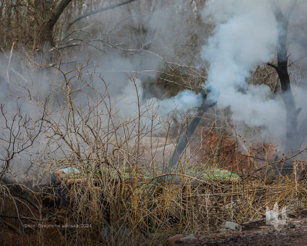 На фото екіпаж машини веде вогонь із напівзакритого капоніра, викопаного заввишки в саму установку та захищеного дахом та сітками від ворожих ударних дронів.