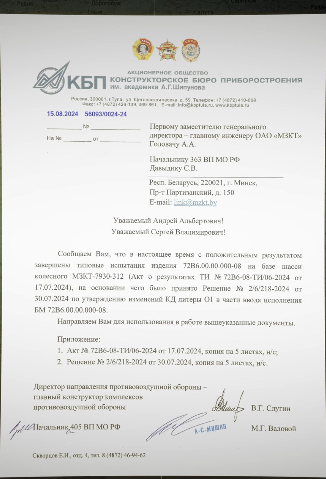 Окремо варто звернути увагу, що згідно з документами для інтеграції на шасі МЗКТ проходив саме бойовий модуль (БМ) 72В6.00.00.000-08. Індекс 72В6 вказує на те, що йдеться саме про модифікацію «Панцирь-С1» для потреб ЗС РФ, а не експортні версії чи модернізовану версію «Панцирь-С2».