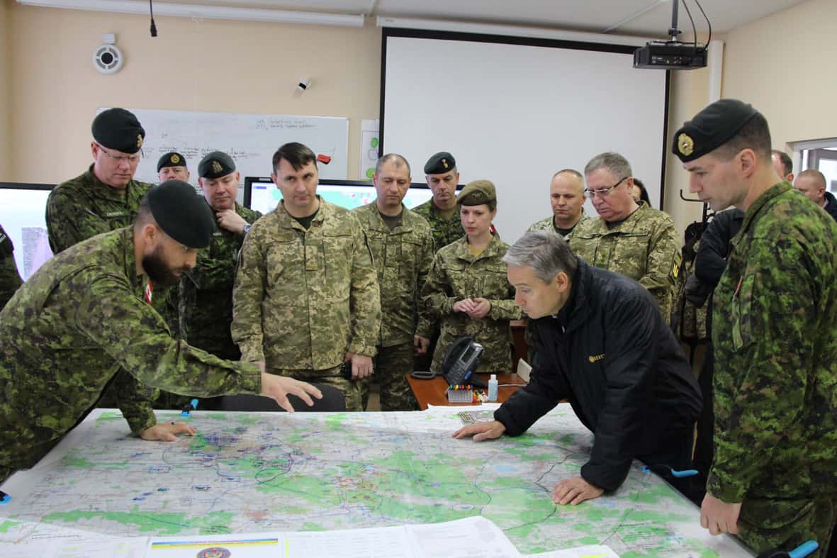 Представники Канади зустрілися з військовослужбовцями ЗС Канади в Україні, відвідали Центр імітаційного моделювання, побачили процес підготовки штабів та спостерігали за практичними діями українських військовиків під час відпрацювання практичних завдань в умовах міської забудови.