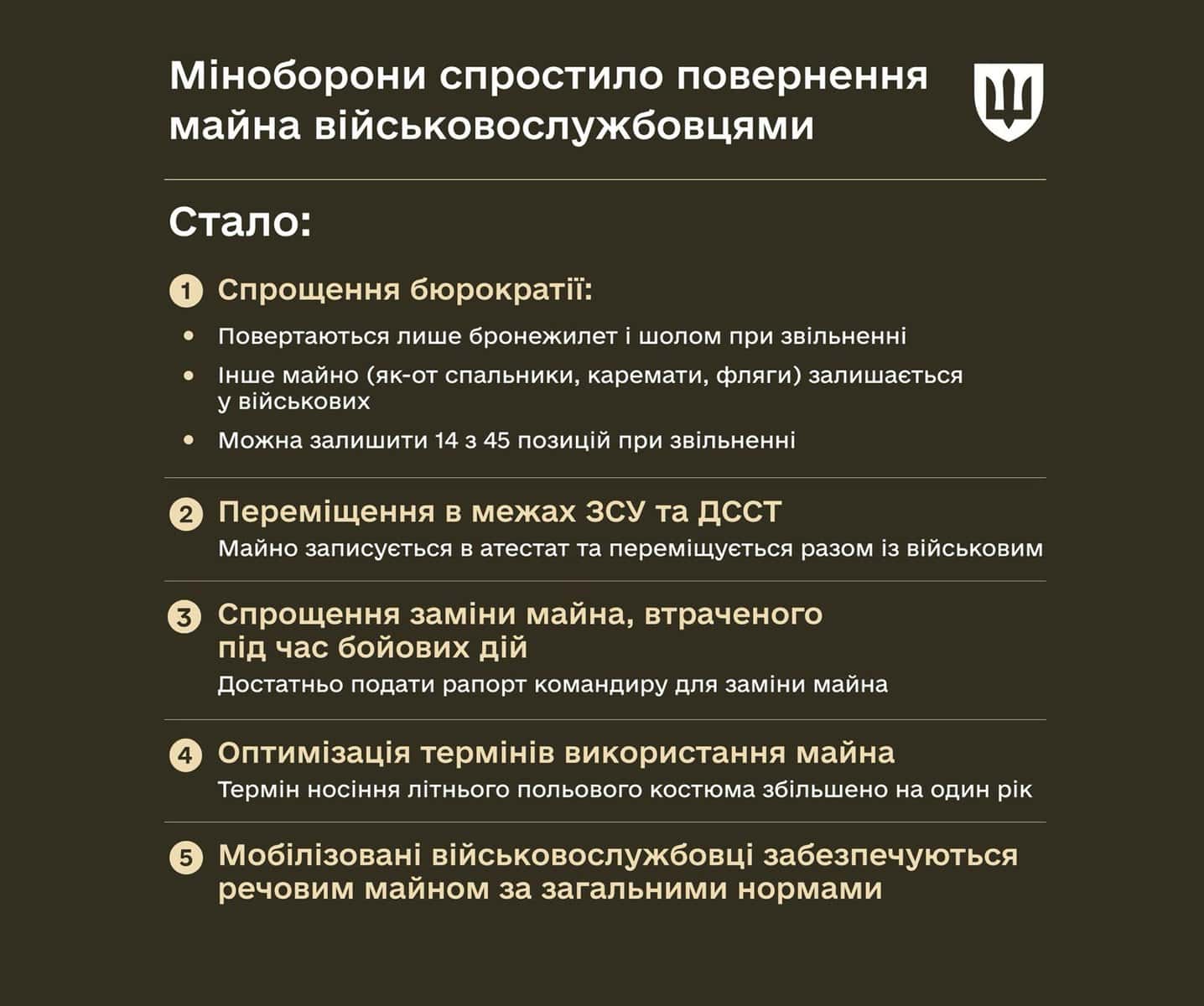 Деталізується, що при звільненні можна залишити 14 із 45 позицій. Крім того, майно тепер записується в атестат і переміщується разом із військовим.