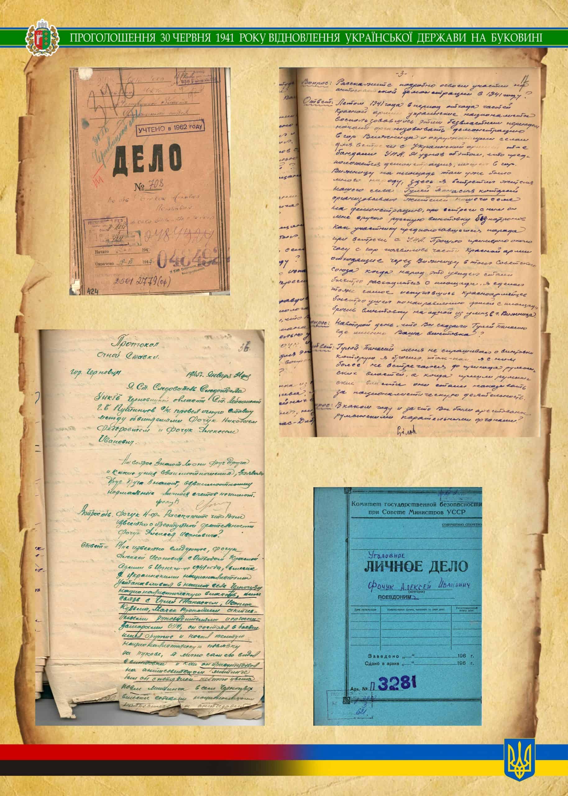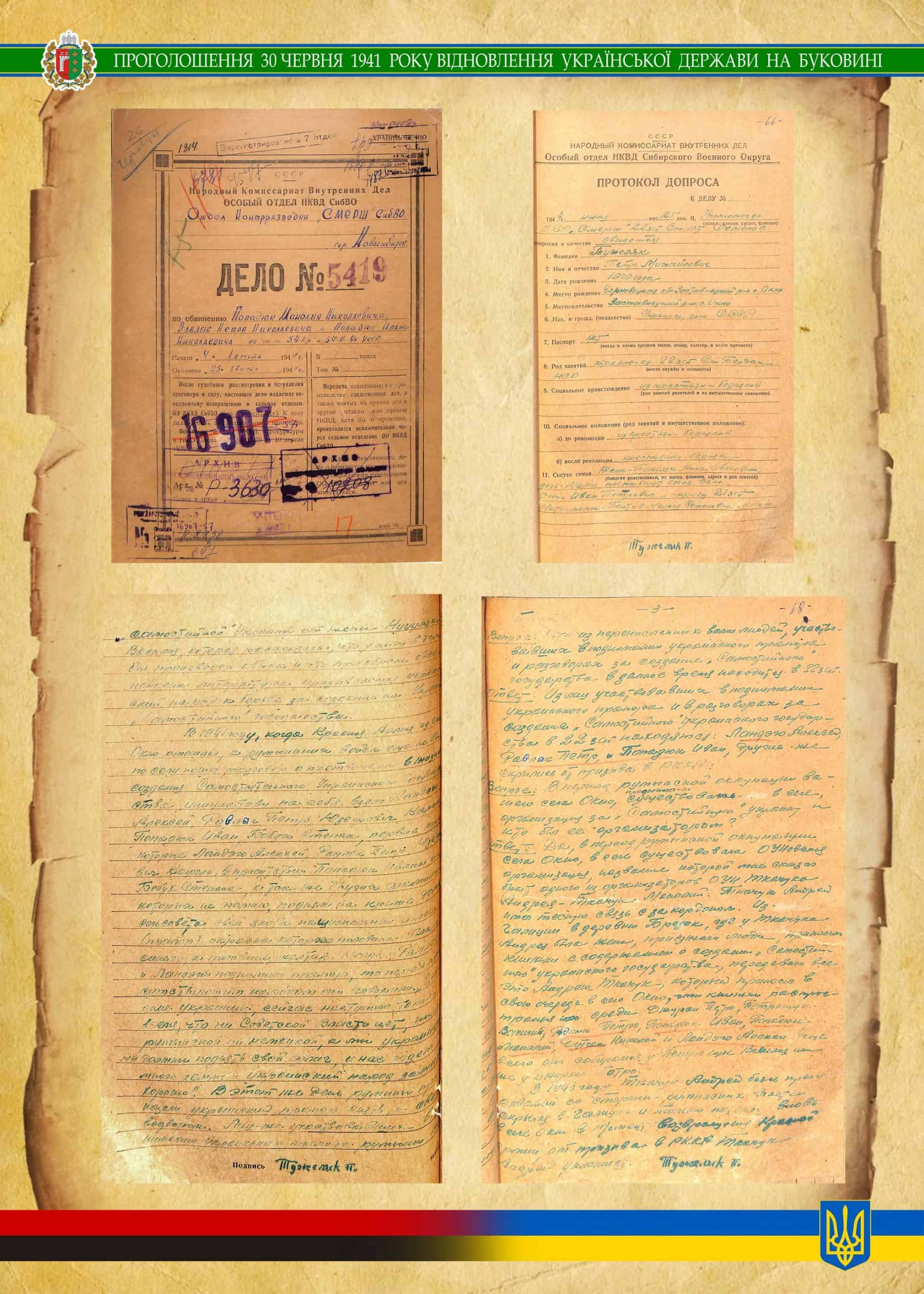 Сенсаційна історична знахідка. Унікальні документи, які знайшли у Державному архіві Чернівецької області, свідчать, що 30 червня 1941 року один із керівників крайового проводу ОУН Мирослав Кіндзірський на Буковині проголосив Українську державу. Буковина 80 років тому боролася за власну державність, а синьо-жовті прапори майоріли у багатьох селах області, – йдеться у повідомленні.