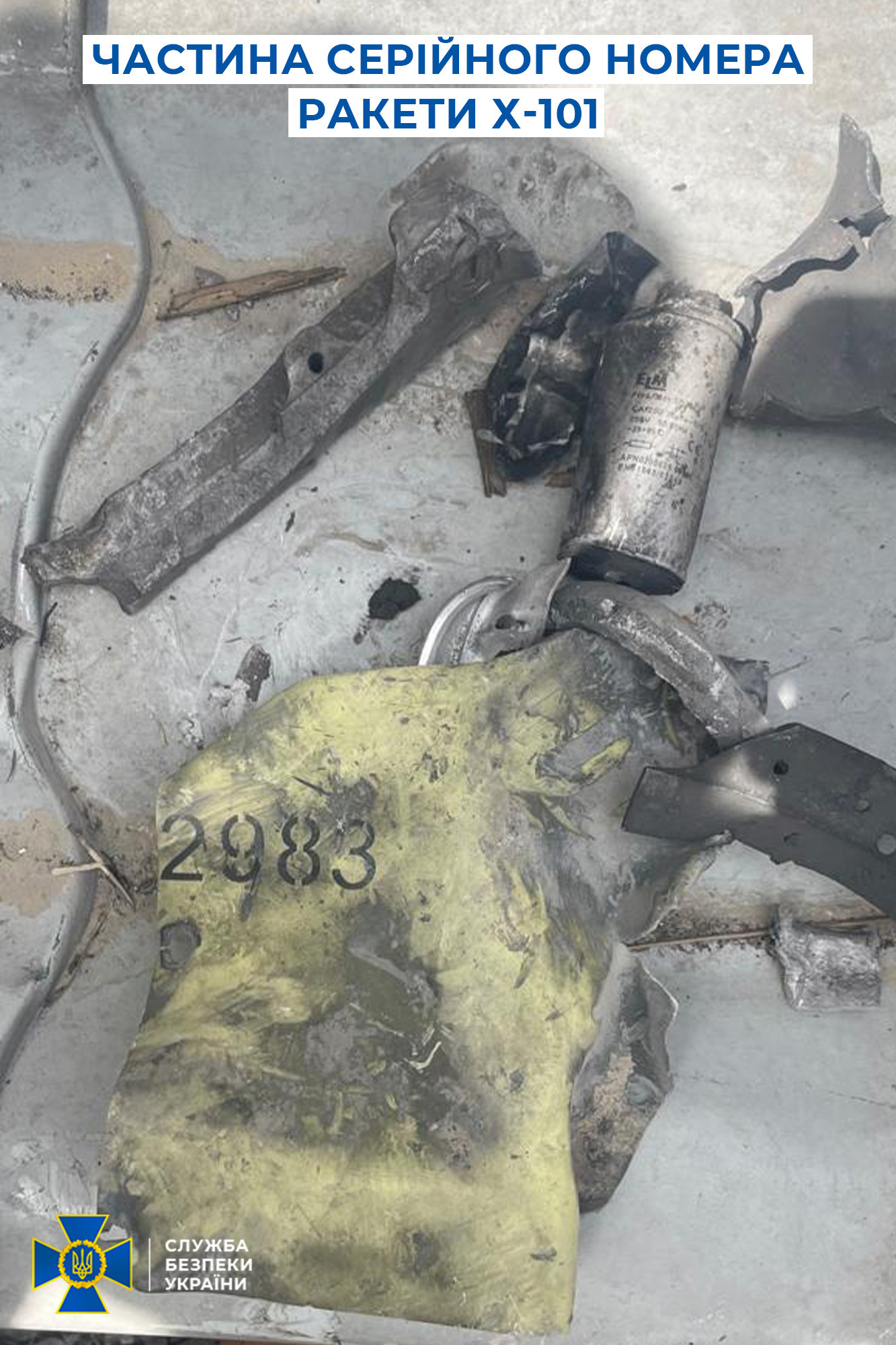 Слідчі СБУ виявили уламки кожуха двигуна крилатої ракети Х-101 із відображенням інвентарного та серійного номерів.
