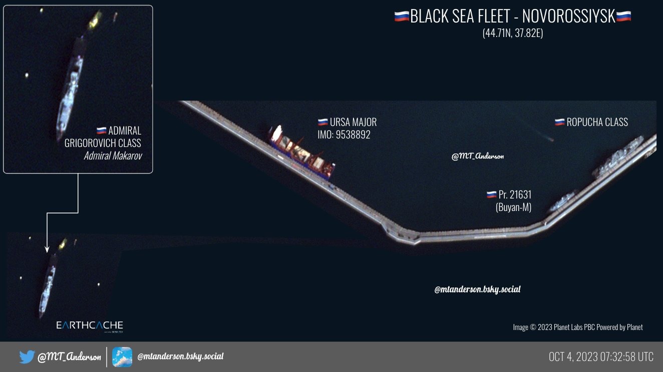 Згідно з аналізом супутникових знімків за 4 жовтня, до Новоросійська було перекинуто шість великих десантних кораблів, фрегати “Адмирал Эссен”, “Адмирал Макаров” та три підводні човни проєкту 636 “Варшавянка”.