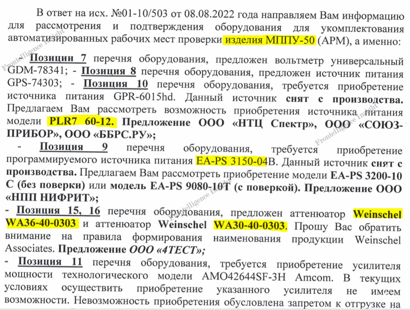 Відповідно до запиту начальника відділу закупівель заводу «Красное знамя» (концерн «Алмаз-Антей») та до керівництва «Микроприбора», у серпні 2022 року останньому передали перелік необхідного обладнання. Воно входить до комплектації автоматизованих робочих місць перевірки та калібрування виробу МППУ-50.
