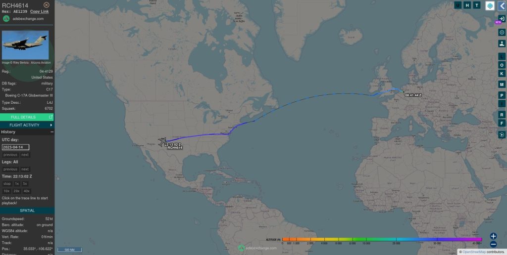 10 квітня перший C-17 вилетів з Кляйне до Рамштайну. А наступного дня другий борт вирушив на авіабазу Волкель у Нідерландах, яка є місцем дислокації 703-ї ескадрильї забезпечення боєприпасів ПС США і виконує ті самі задачі.