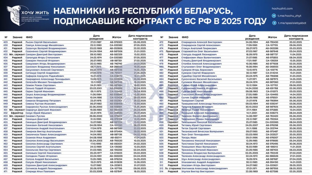 Аналітики отримали у своє розпорядження списки з іменами, особистою інформацією, званнями та номерами жетонів 596 білорусів, які пішли на службу в ЗС Росії з січня по липень 2025 року. Встановлено, що з цього списку 96 осіб мали статус загиблих на момент публікації.