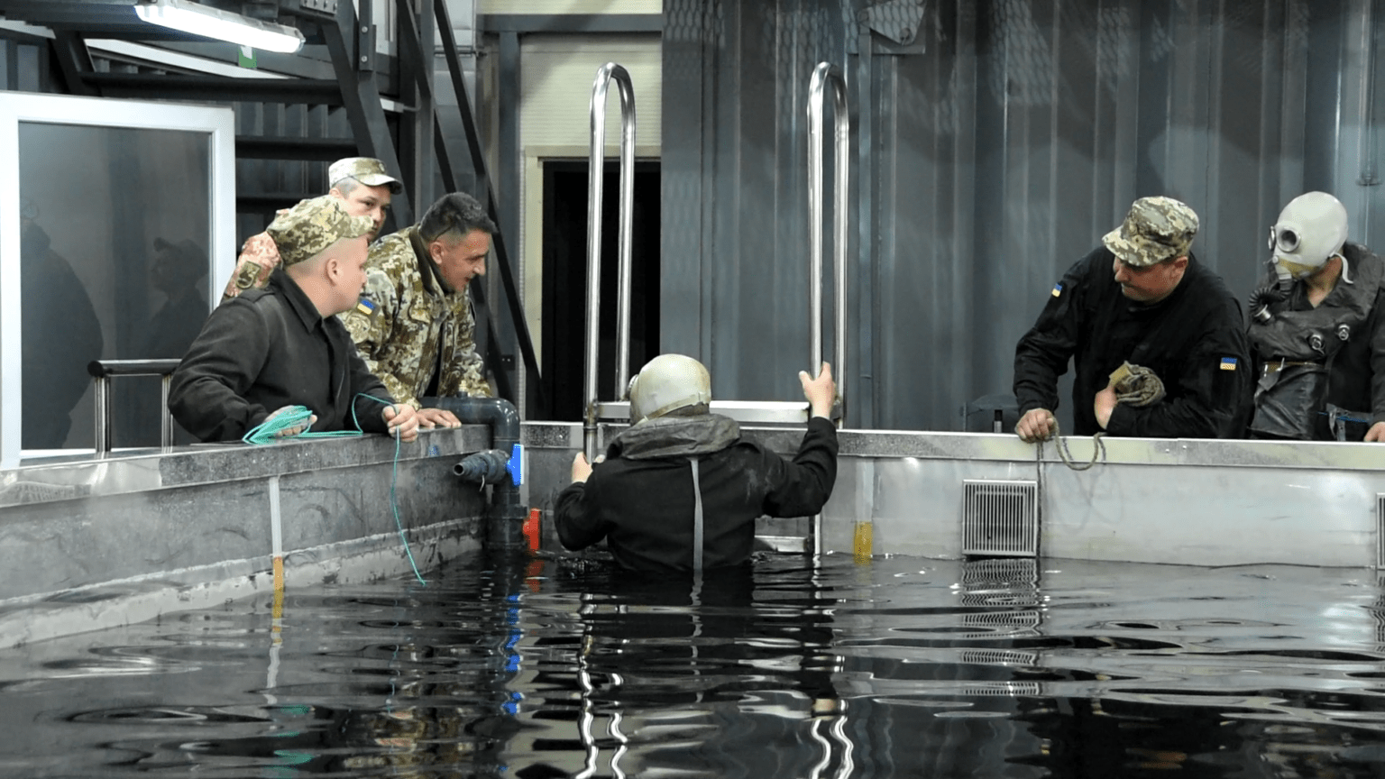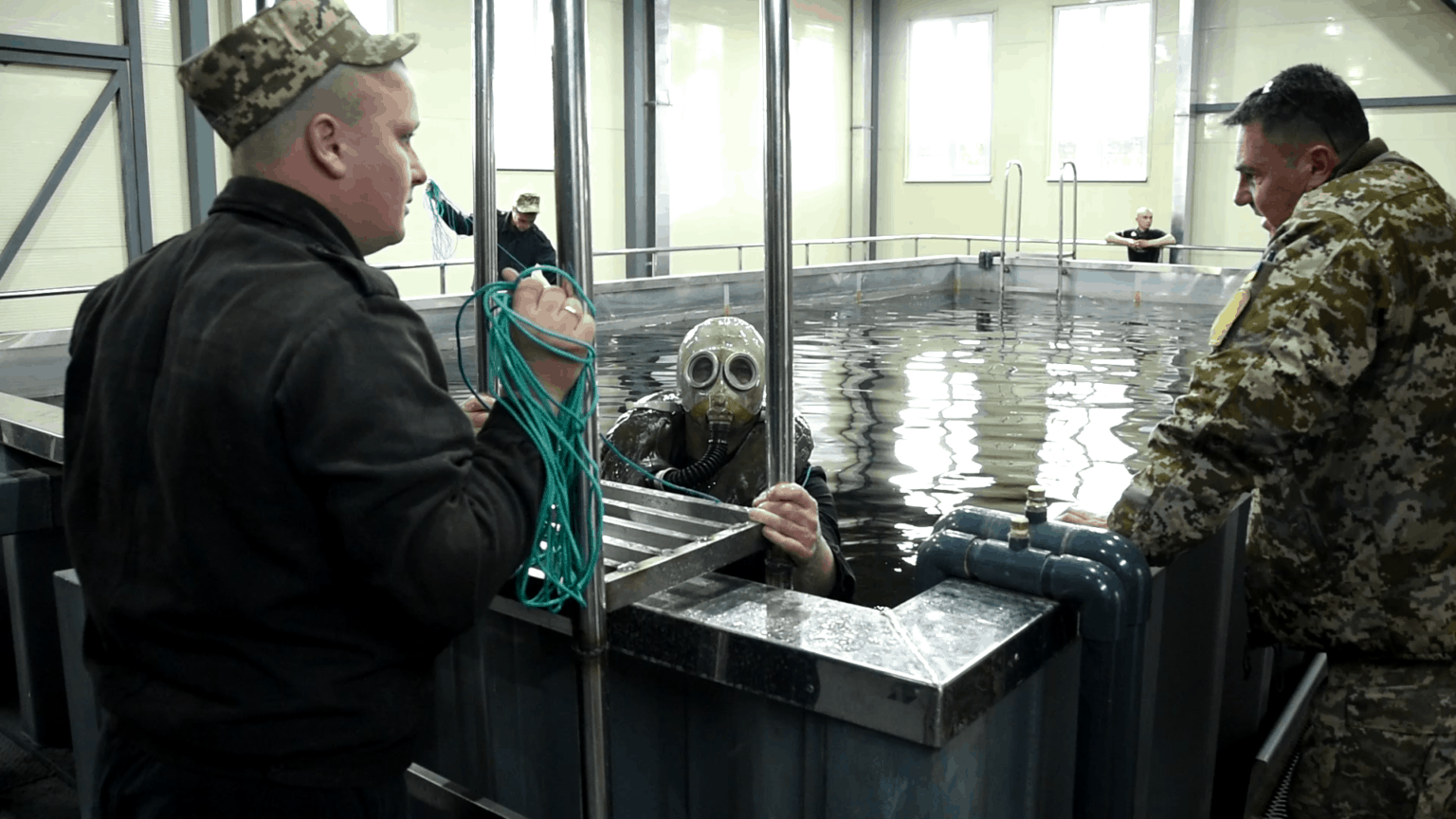 Весь особовий склад, який тут навчається, використовує легкі ізолюючі протигази ІП-5 – це індивідуальні засоби захисту, які можна застосовувати на глибині до 7 метрів.