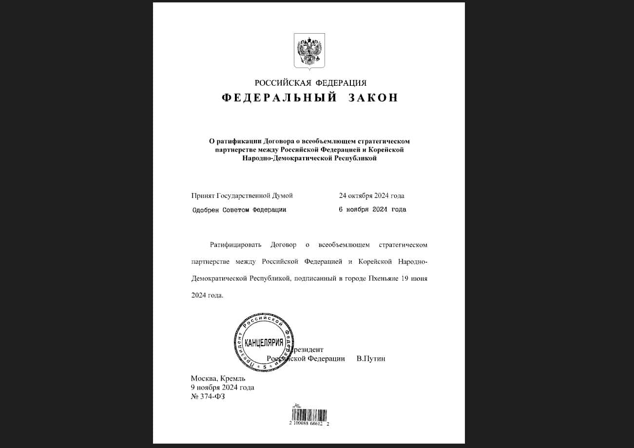 Сам договір був підписаний у червні цього року під час візиту Путіна до Північної Кореї і кілька днів тому схвалений Федеральними зборами РФ.